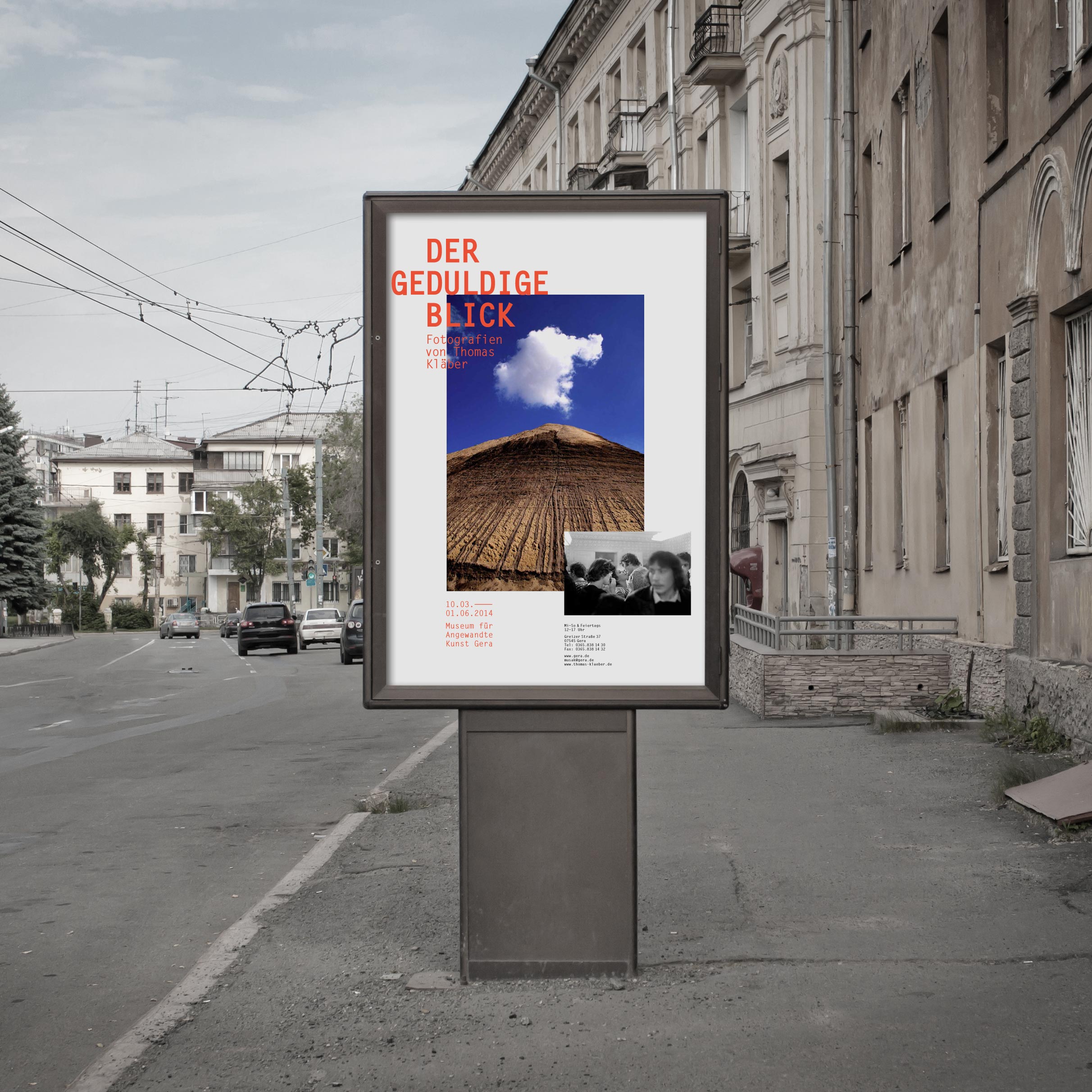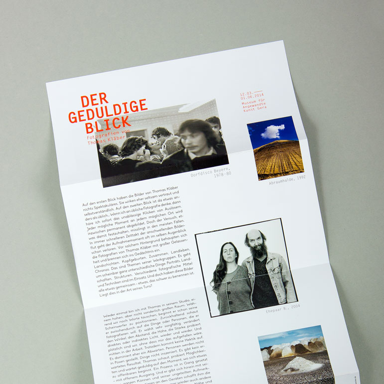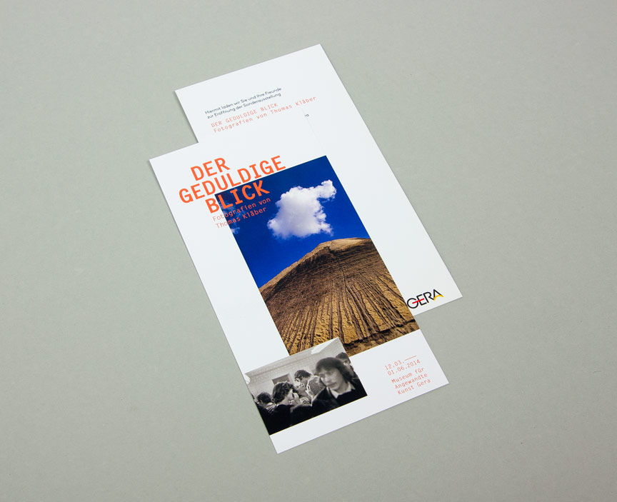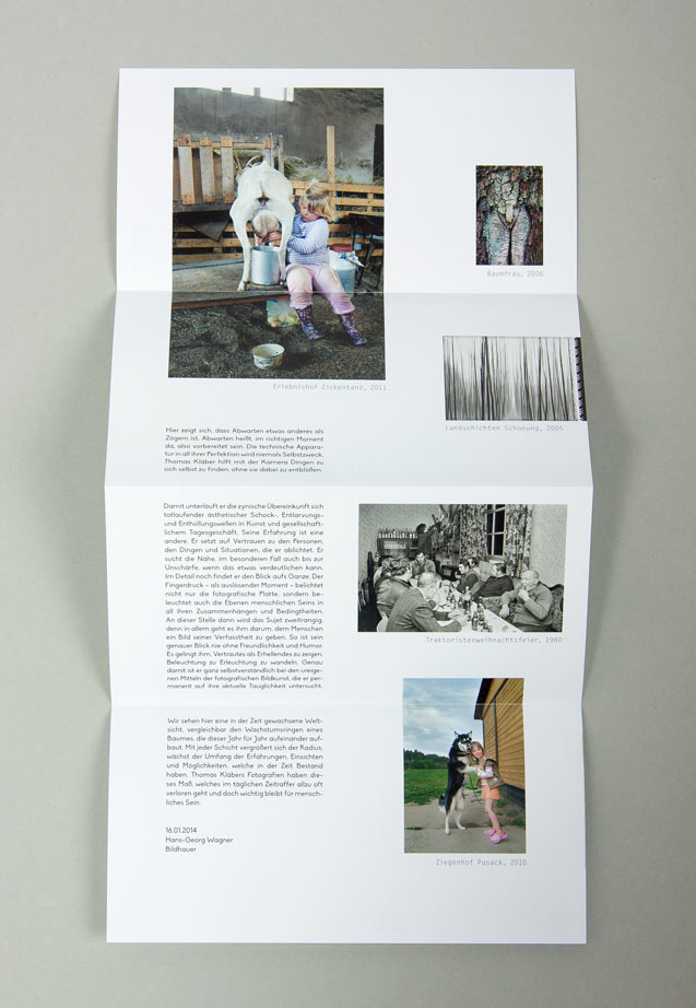 Das fotografische Werk Thomas Kläbers bewegt sich zwischen Portät- und Landschaftsfotografie sowie Farb- und Schwarzweißfotografie – immer auf der Suche nach den perfekten Augenblick. Die Medien zur Ausstellung visualisieren dieses Spannungsfeld durch die Überlagerung und Gegenüberstellung von kontrastierenden Motiven, Bildgrößen und -farben.
