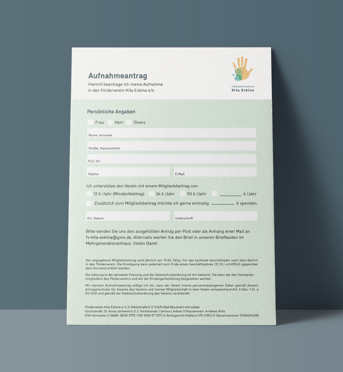 Die Räume der Kita Arche Noah sind durch Hochwasser unbenutzbar geworden. Um Förderungen und Spendengelder für die Renovierung zu sammeln, benötigten sie eine Geschäftsausstattung für ihren Förderverein.