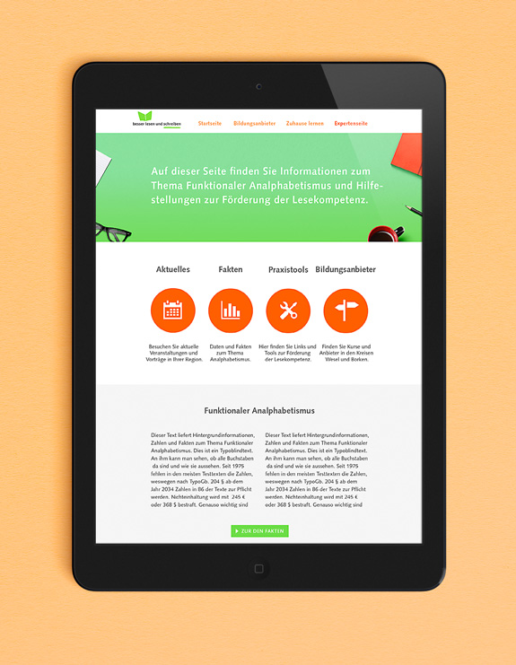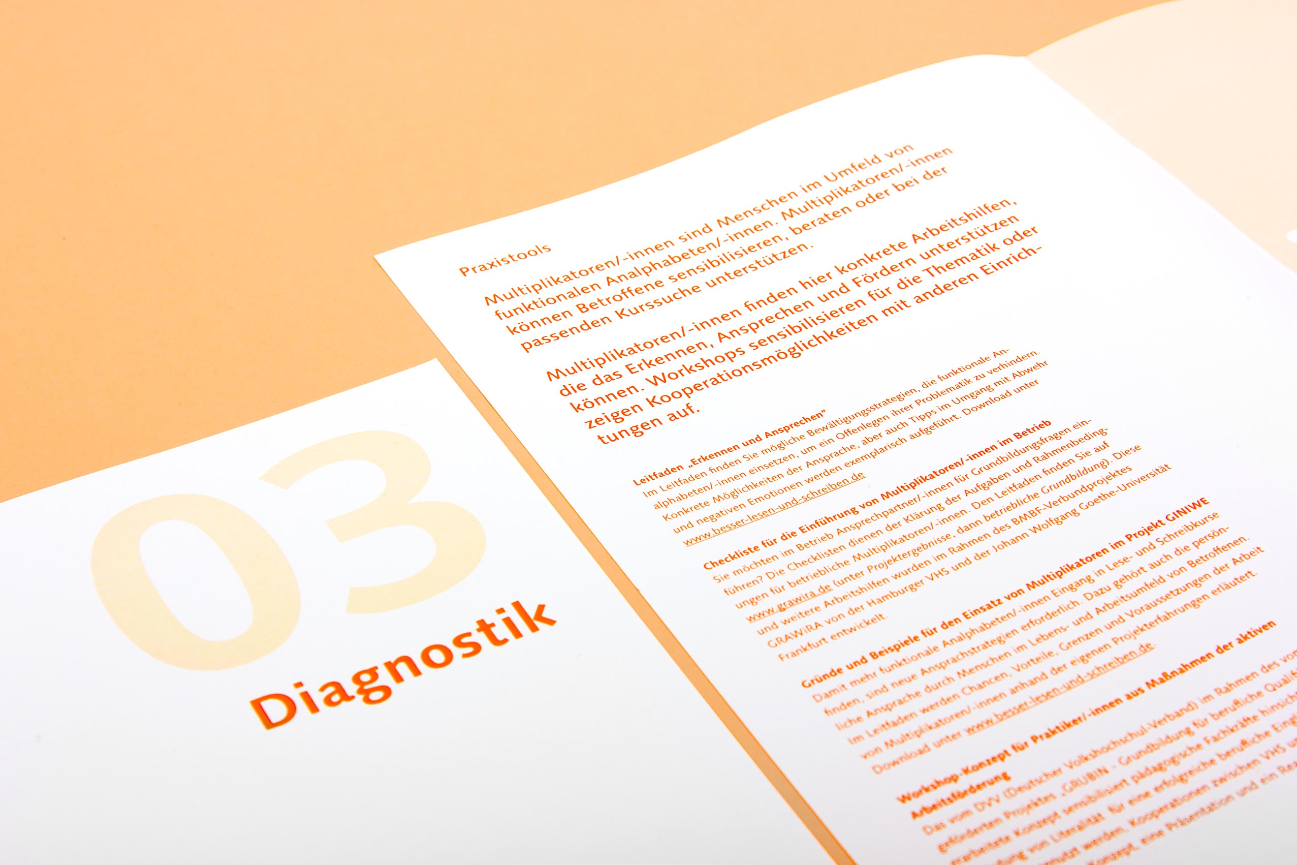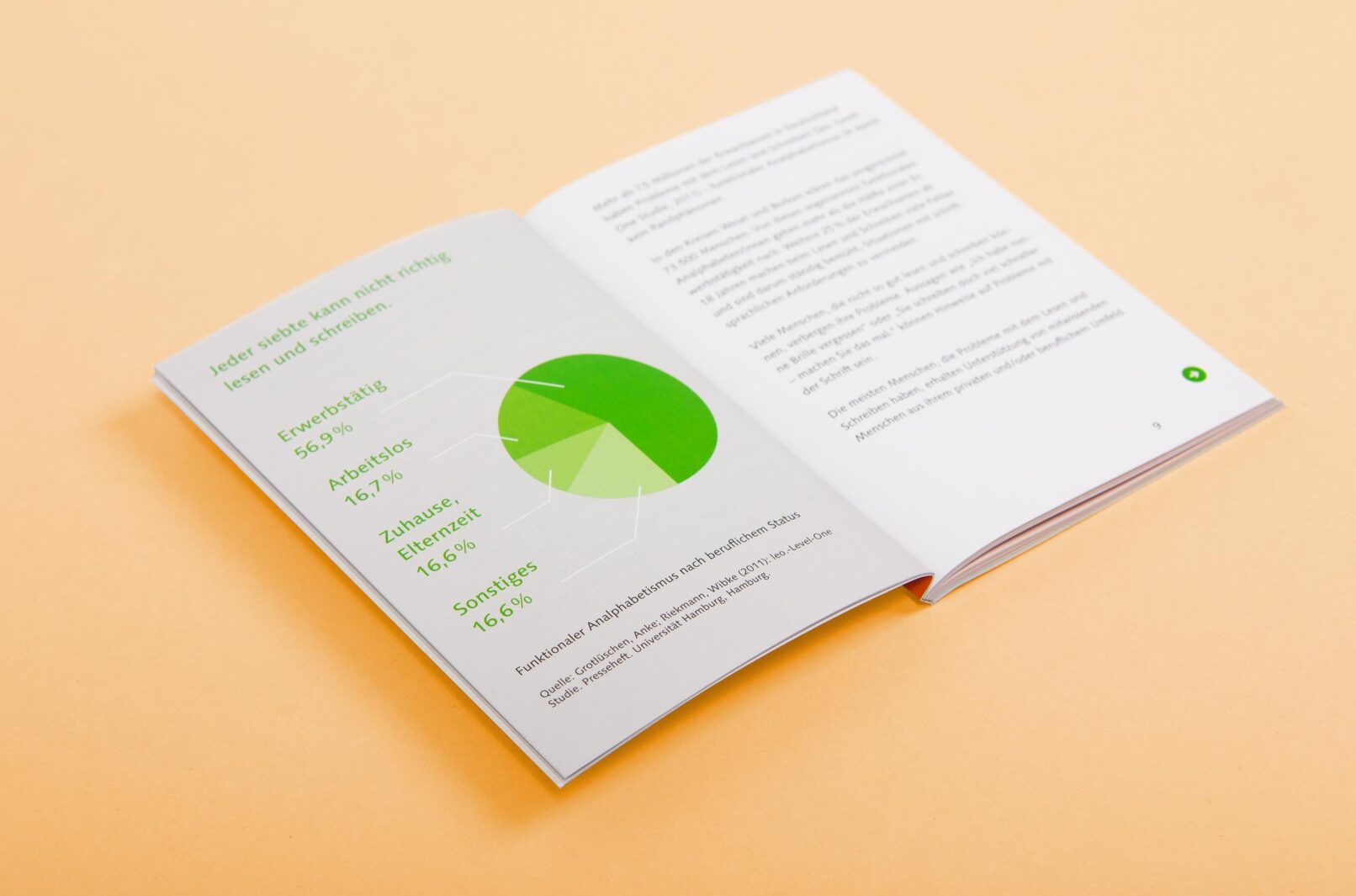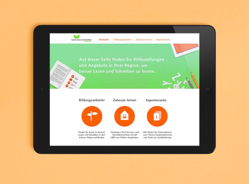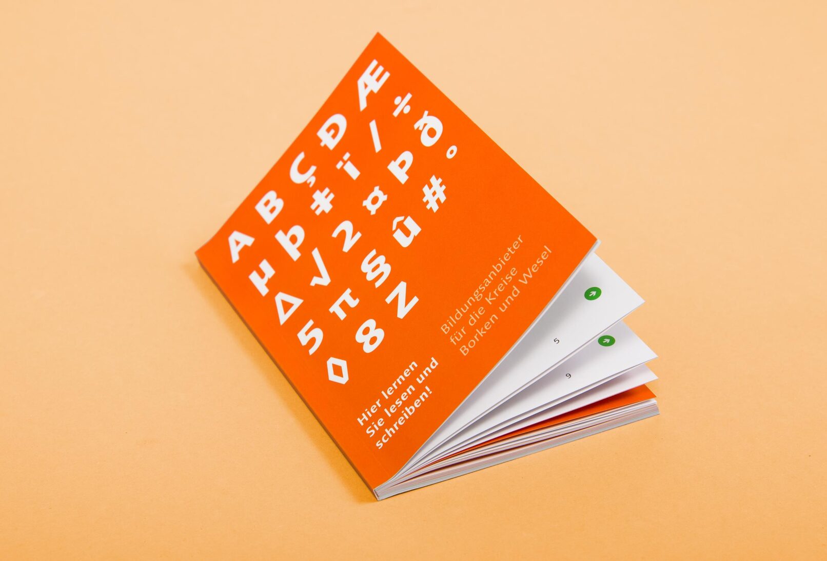 Mehr als jeder zehnte Arbeitnehmer in Deutschland kann nicht richtig lesen und schreiben. Die Grundbildungs-Initiative Niederrhein und Westmünsterland will für dieses Thema sensibilisieren, Akteure vernetzen und die Lesekompetenz in den Kreisen Borken und Wesel fördern. Für die Projektmedien habe ich ein Konzept entwickelt, das sowohl Bildungsanbieter als auch funktionale Analphabet:innen anspricht. Dabei steht die Lesbarkeit der Texte im Vordergrund, unterstützt durch eine visuelle Zweisprachigkeit: eine bildlastige Ebene fasst alle wichtigen Informationen für leseschwache Menschen zusammen, während eine textlastige Ebene Tools und Hintergrundinformationen für Expert:innen bietet. So werden Inhalte für alle Zielgruppen zugänglich und verständlich vermittelt.