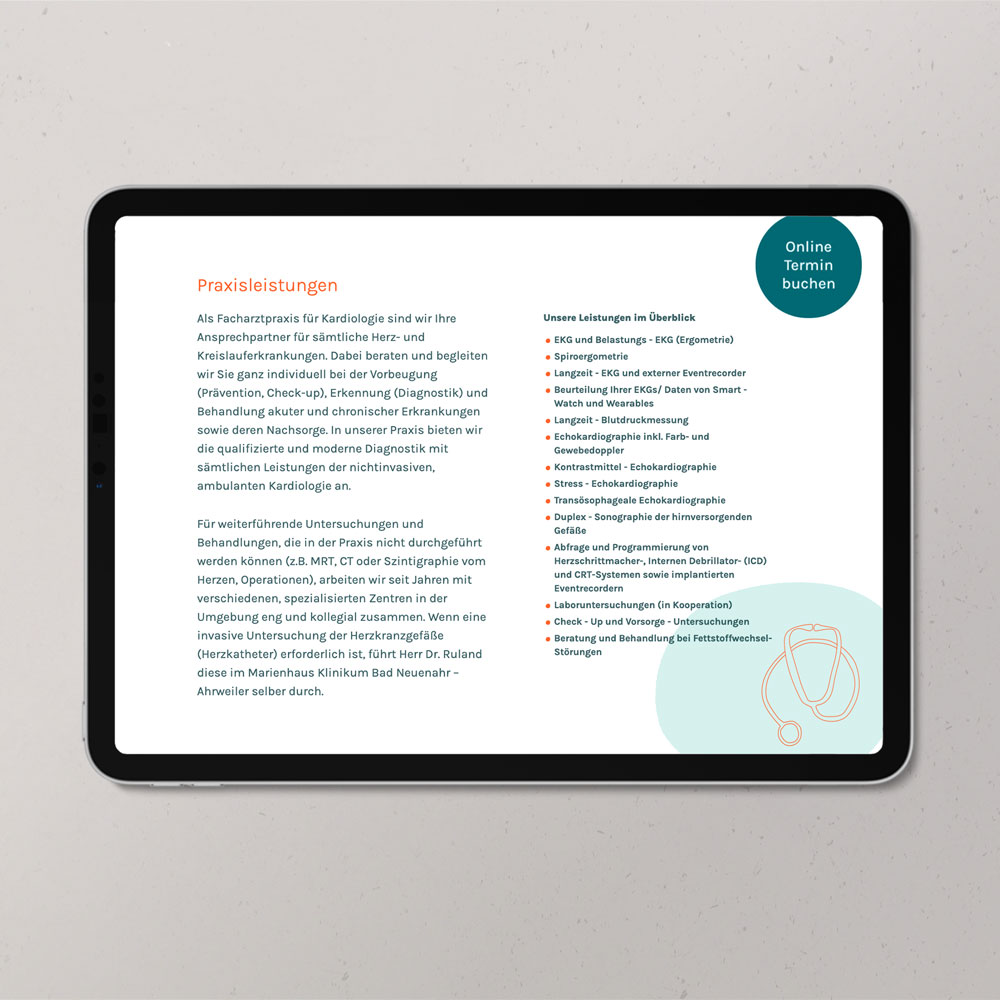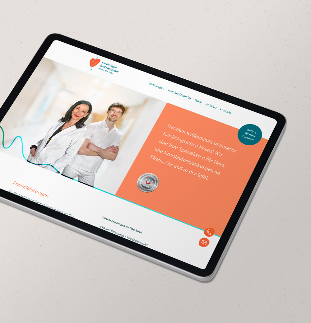 Projektumfang: Logo, Schriften, Farbkonzept, Bildsprache, Grafiken, Terminzettel, Webdesign | Kunde: Kardiologie Bad Neuenahr