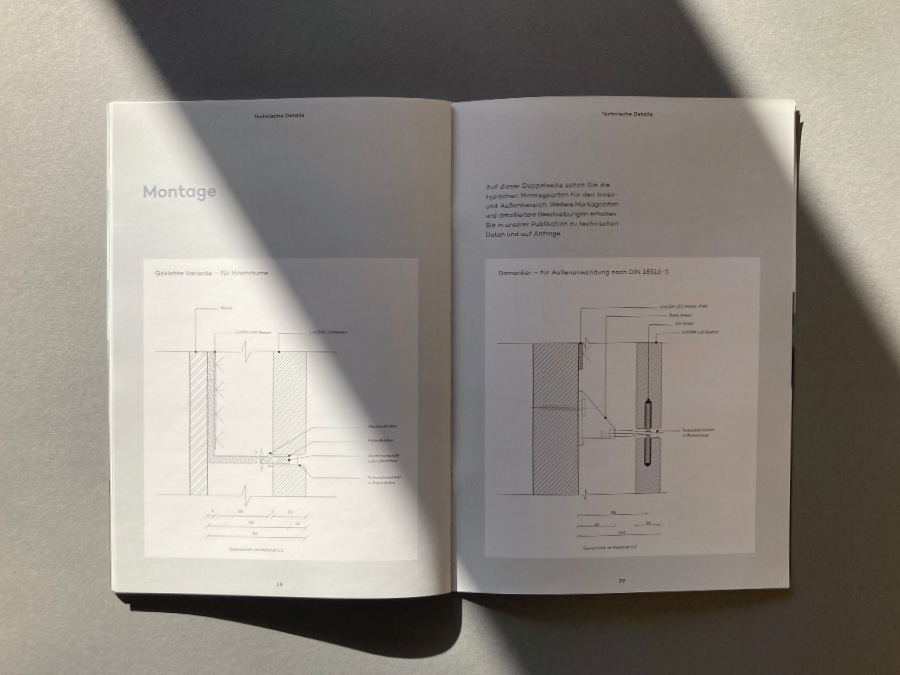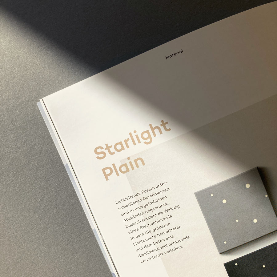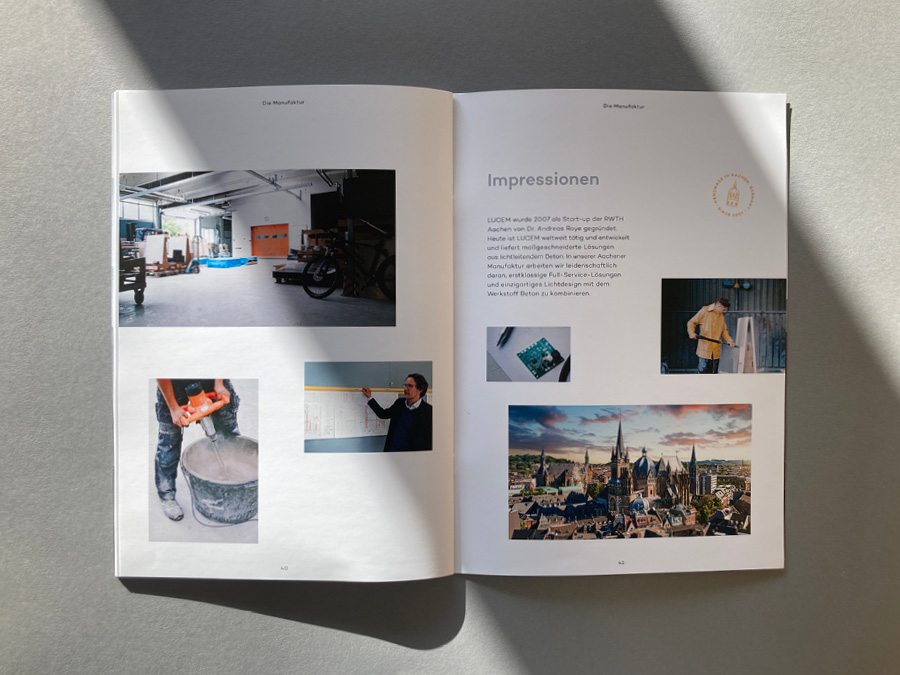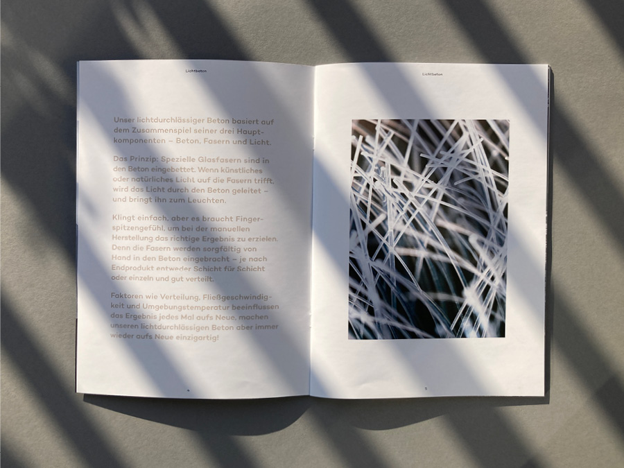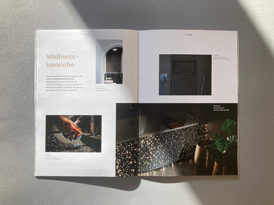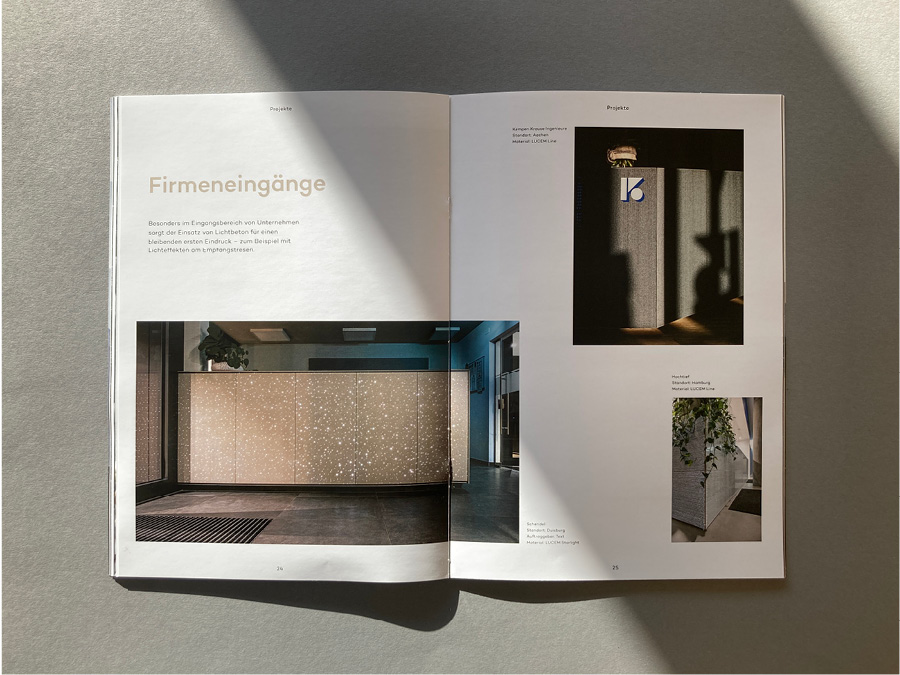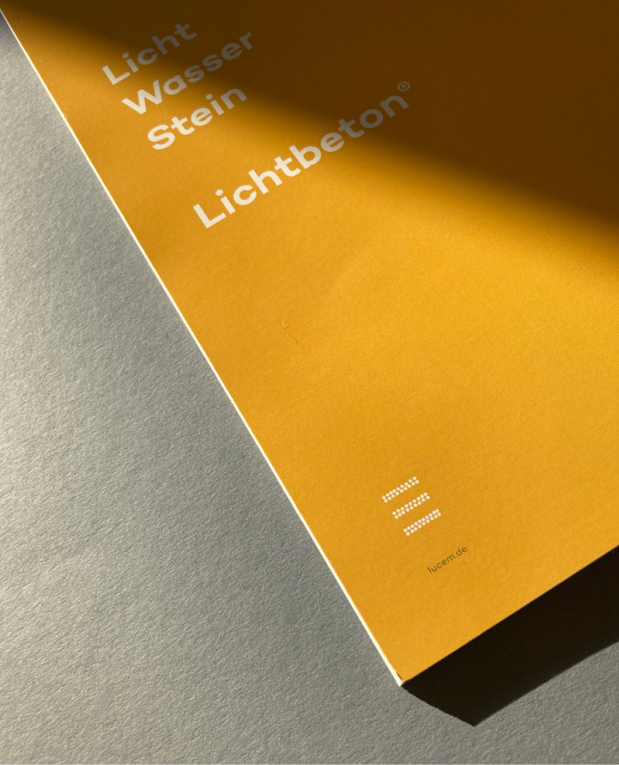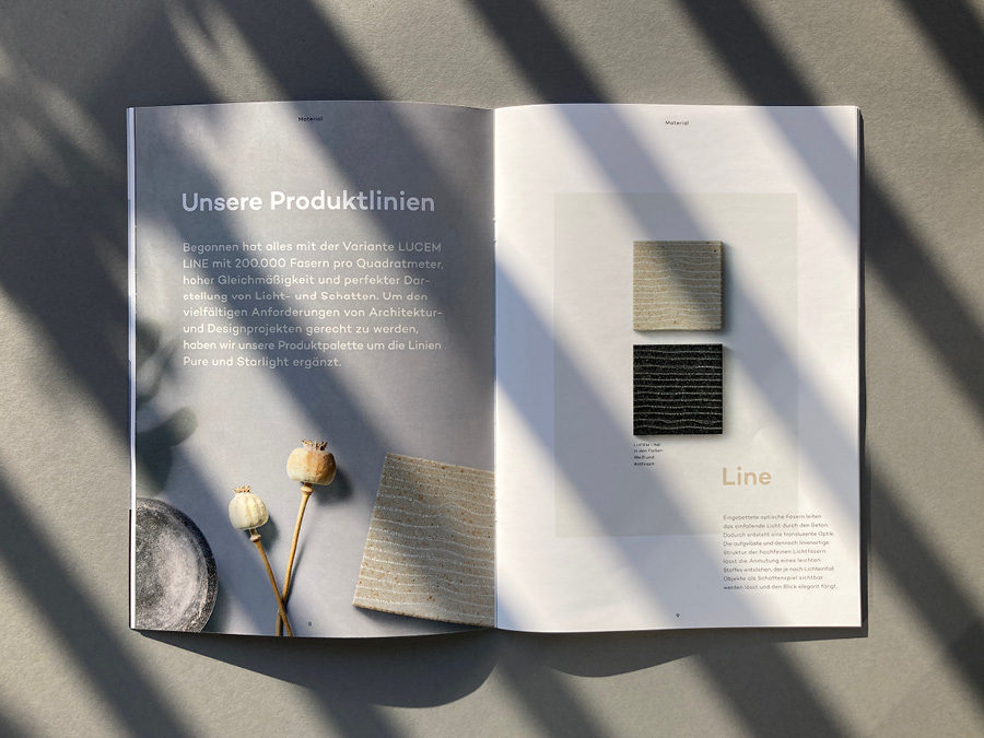 Für LUCEM – ein Unternehmen, das lichtleitenden Beton entwickelt – habe ich eine Broschüre gestaltet, die als Kombination aus Produktkatalog und Imagepublikation funktioniert.